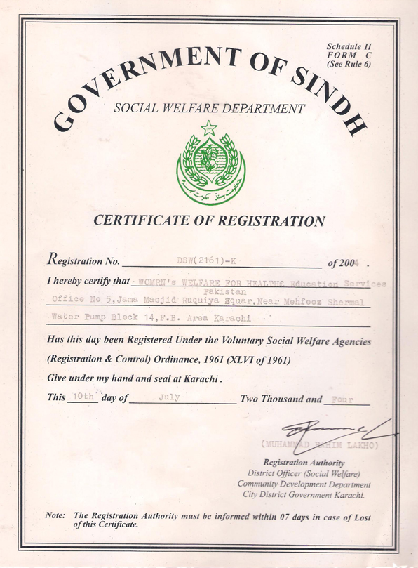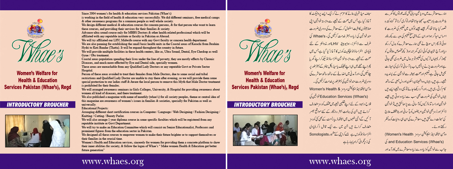 Women's welfare for Health & Education Services Pakistan Whae's), Regds Since 2004 women's for health & education services Pakistan (Whae's) is working in the field of health & education very successfully. We did different seminars, free medical camps & other awareness programs for a common people as well whole society.